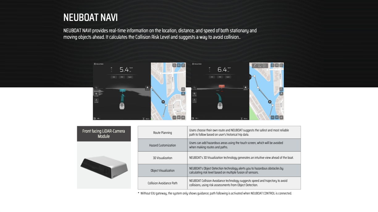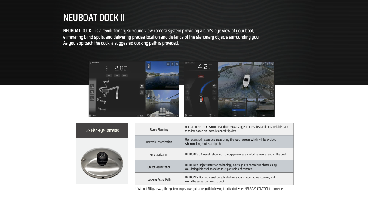 We offer the Avikus NEUBOAT line of products – including the DOCK II 360° Camera and NAVI LiDAR Systems. These smart navigation and docking solutions use advanced sensors and cameras to help you navigate with confidence and provide a stress-free boating experience.